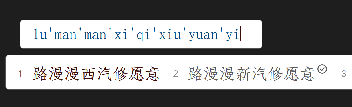 但最近这几天,我发现,搜狗赖以生存的输入法准确性,联想,长句,居然都输给了微软的中文输入法,真是越活越回去了。我目前主要还是用搜狗,用搜狗打不出来的,我都用微软输入法试了下,结果如下图: